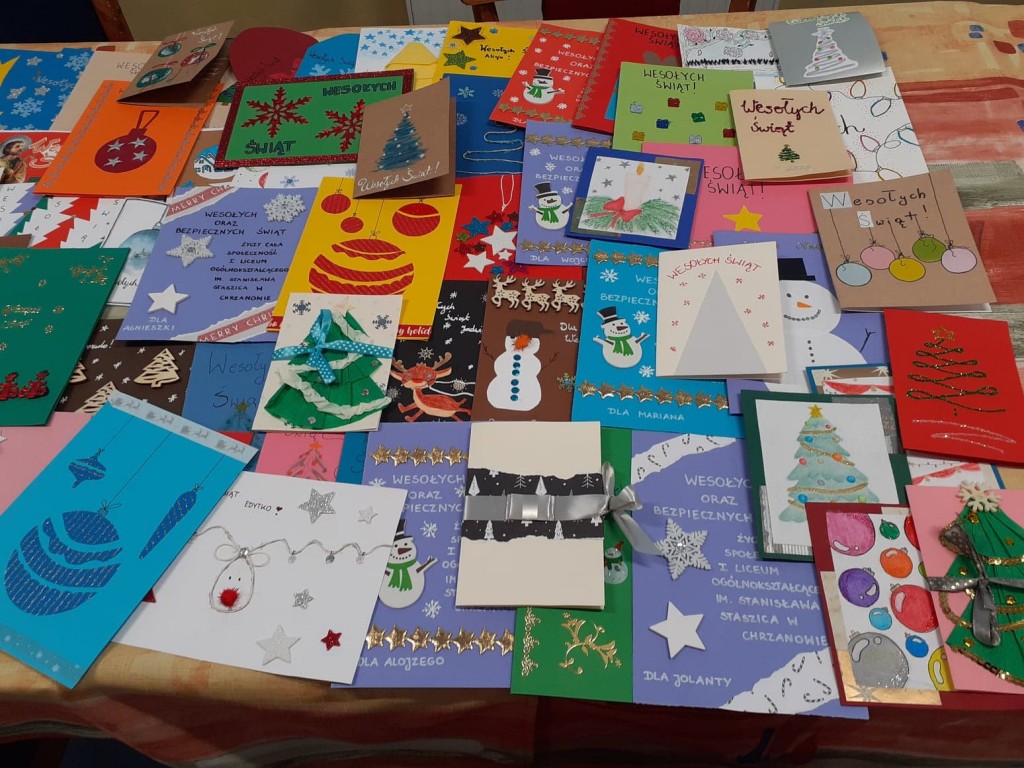 Uczniowie I LO za przygotowali wielkim zaangażowaniem i radością piękne kartki świąteczne dla mieszkańców DPS w Płazie.