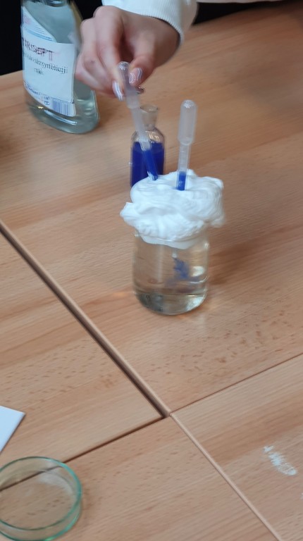 Doświadczenia z chemii "Kolorowa chemia" przygotował student Wydziału Chemii UJ w Krakowie Grzegorz Niedzielski, odbywający praktyki w naszej szkole. Prezentował ciecze, które w niezwykły sposób zmieniały swoje kolory, sprawił, że rysunki wykonane przez uczestników wodą nabrały kolorów. Punktem kulminacyjny było jednak wyprodukowanie sztucznej krwi.