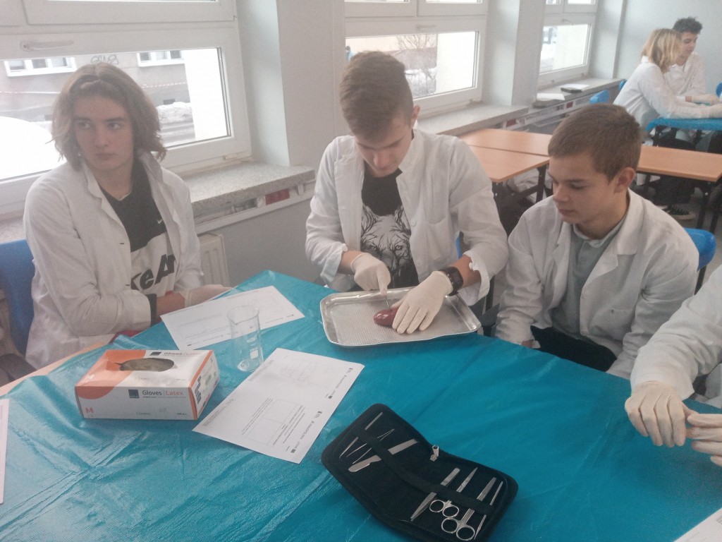 Tematem zajęć była budowa i funkcjonowanie nerki oraz funkcjonowanie organizmu człowieka w warunkach ekstremalnych. Teraz już wszyscy wiedzą, co się dzieje w naszym organizmie, jak nurkujemy, czy też przebywamy w wysokich górach. Następnie uczniowie wykonali sekcję nerki i płuca. Zajęcia prowadzone są we współpracy z Uniwersytetem Jagiellońskim w Krakowie.