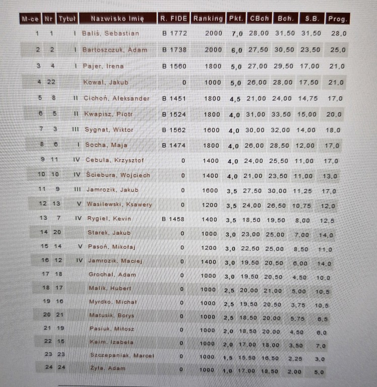 W dniu 24.09 w naszej szkole odbyły się Mistrzostwa Szkoły w Szachach SZACHY OPEN edycja 2025/2026. W turnieju wzięło udział 24 zawodników, w tym 3 dziewczyny. Większość ze startujących szachistów to profesjonaliści więc jak zawsze poziom sportowy zawodów był bardzo wysoki. Graliśmy systemem szwajcarskim, 7 rund, z limitem czasowym 10 minut dla zawodnika. Nad prawidłowym przebiegiem turnieju czuwał nasz absolwent, sędzia szachowy Przemek Małecki, dla którego nie ma tajemnic profesjonalny, turniejowy komputerowy program szachowy CHESS ARBITER .